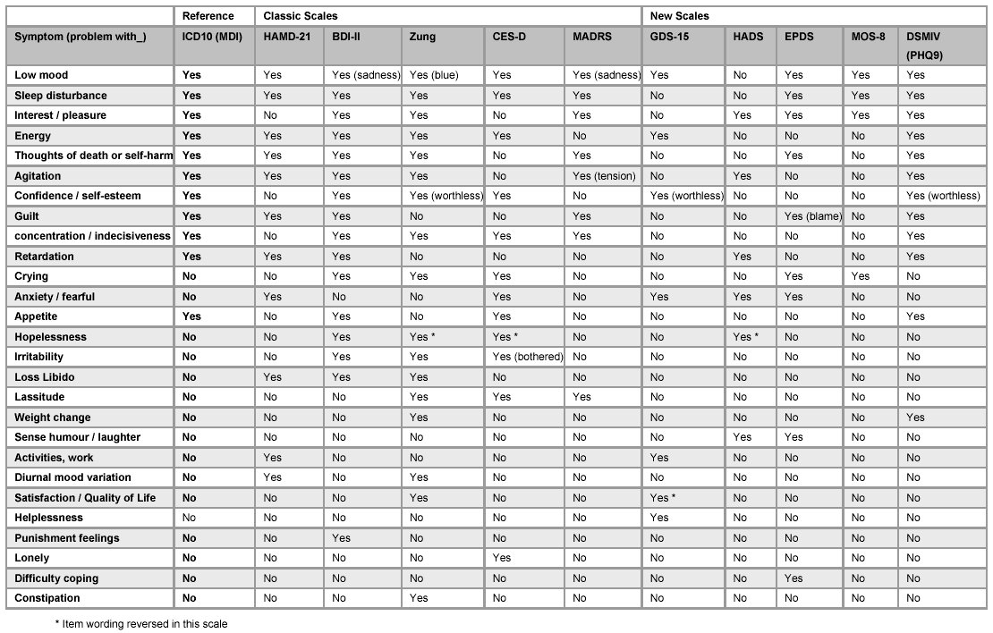 Here is an item by item symptom comparison of the most common depression scales. Email me for alternate versions of this chart and permission to reproduce. Return to tools page